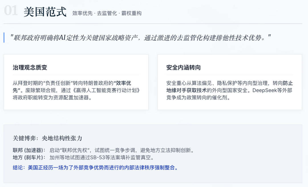 2025年,在政府更迭与外部技术突围的双重驱动下,美国AI治理格局正迎来历史性的范式调整。联邦层面的战略重心从拜登时期的“负责任创新”显著转向特朗普政府的“效率优先”。特朗普政府致力于通过去监管化降低行政成本,以确立地缘政治竞争优势;而以加州为代表的地方立法机构则试图填补联邦监管调整后的空间,密集出台了针对具体应用场景的防御性法案。然而,随着《构建国家人工智能政策框架》的发布,联邦政府明确将AI定性为关键国家战略资产,判定州级分散式立法可能影响国家整体战略的实施。这种央地取向的结构性差异,使得美国AI治理体系形成了一种“联邦侧重加速、地方侧重兜底”的复杂博弈结构,并最终演化为一场关于监管主权的深层法律协调难题——这实质上是联邦政府试图通过强化内部统筹来服务于外部竞争优势的重塑。