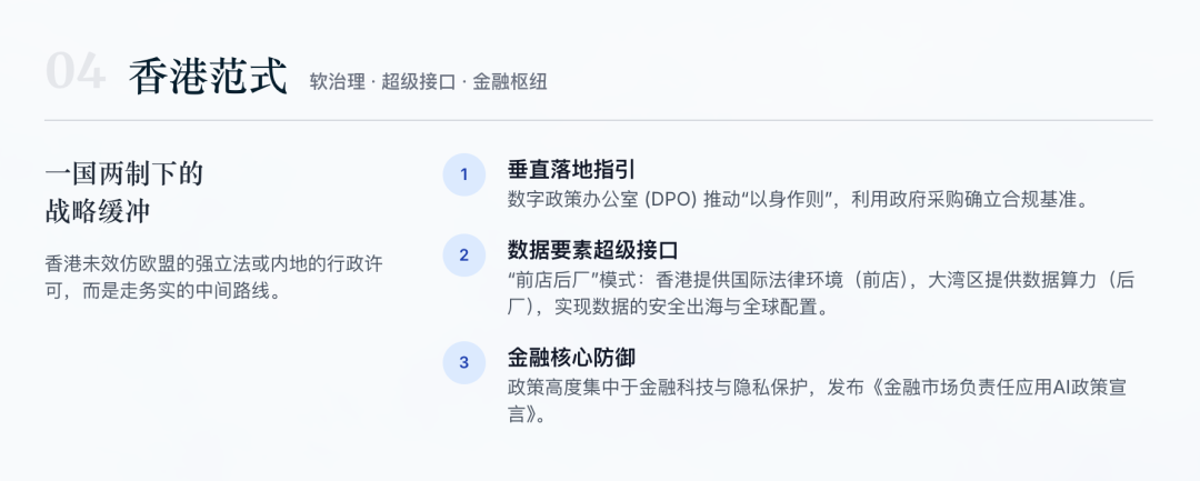 2025年的香港AI治理走的是一条务实的中间路线。它既未采纳欧盟式的严苛立法,也未照搬内地的行政管控,而是保留了类似于普通法系国家的灵活性与透明度。香港试图向全球投资者传递明确信号:在此既可利用中国庞大的数据资源与场景优势,又能享受透明、可预期的监管环境。这种制度接口与资源腹地相结合的模式,构成了2025年香港AI政策的核心逻辑。