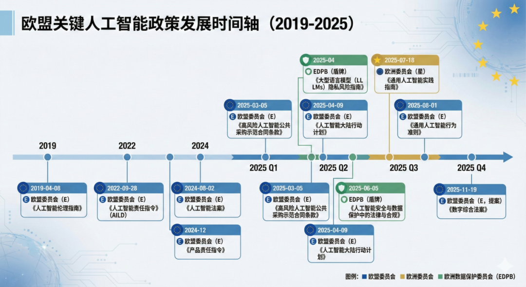 在微观技术层面,欧盟依然致力于编织严密的合规法网,但在落地方式上采取了引导姿态。2025年8月2日是《人工智能法案》中通用目标人工智能(GPAI)模型规则生效的关键节点。为此,欧盟于7月发布了《通用人工智能实践指南》,并依托AI办公室推动制定了《通用人工智能行为准则》。这些文件为大模型提供商划定了透明度、版权及系统性风险评估的义务边界,试图将抽象的法律条文转化为可操作的技术标准。
