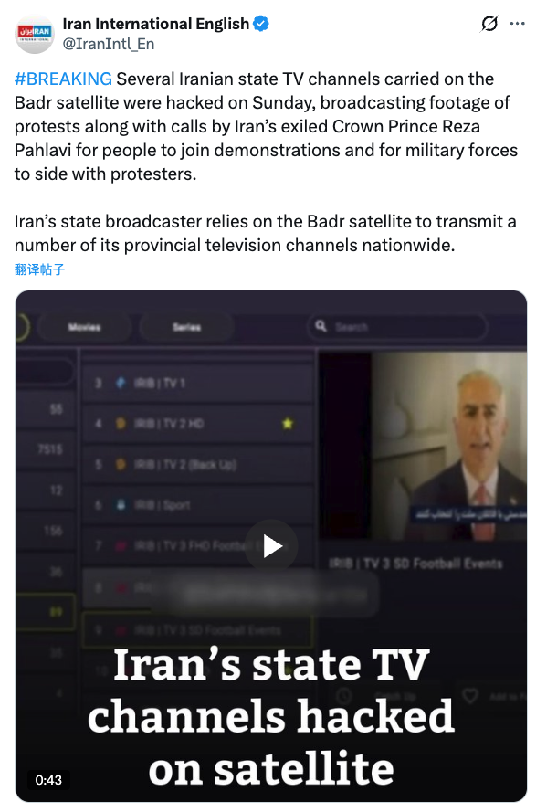 安全内参1月20日消息,据多家外媒报道,1月18日(星期日),伊朗国家电视台多个频道一度遭到劫持,正常节目被中断,转而播放抗议画面以及一名流亡反对派人物的相关信息。
