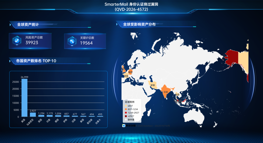 奇安信鹰图资产测绘平台数据显示,SmarterMail 身份认证绕过漏洞(QVD-2026-4572)关联的全球风险资产总数为39923个,关联IP总数为19564个。全球风险资产分布情况如下: