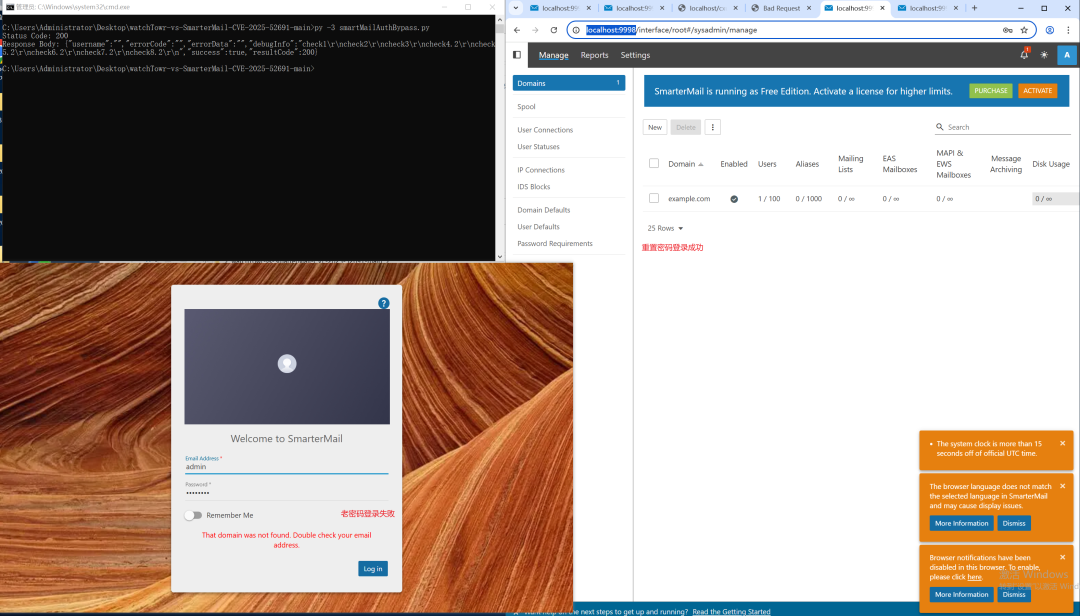 目前,奇安信威胁情报中心安全研究员已成功复现SmarterMail 身份认证绕过漏洞(QVD-2026-4572),截图如下: