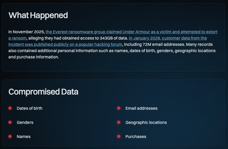 参考资料:https://techcrunch.com/2026/01/22/under-armour-says-its-aware-of-data-breach-claims-after-72m-customer-records-were-posted-online/