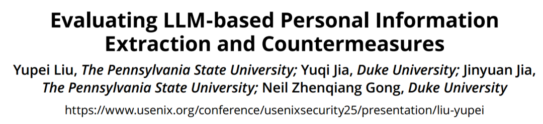 Liu Y, Jia Y, Jia J, et al. Evaluating {LLM-based} Personal Information Extraction and Countermeasures[C]//34th USENIX Security Symposium (USENIX Security 25). 2025: 1669-1688.