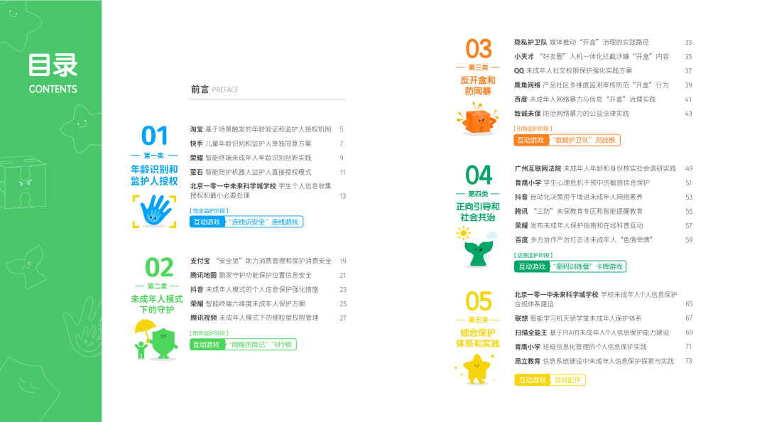 《案例集》不仅汇聚了包含社交、支付、教育、社区、网购、工具等功能的网络服务应用程序运营者,以及智能手机、儿童手表、学习机和陪伴机器人厂商提供的未成年人个人信息和网络保护的前沿实践,也包括了校园保护、司法实践、媒体宣传等社会共治的代表性案例。《案例集》将27个不同的实践案例划分为“年龄识别和监护人授权”、“未成年人模式下的守护”、“反开盒和防网暴”、“正向引导和社会共治”、“综合保护体系和实践”五个主题。