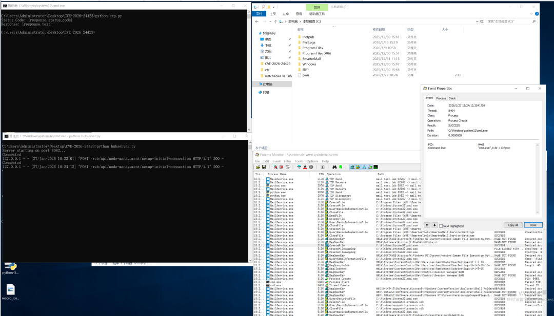 目前,奇安信威胁情报中心安全研究员已成功复现SmarterTools SmarterMail 远程代码执行漏洞(CVE-2026-24423),截图如下: