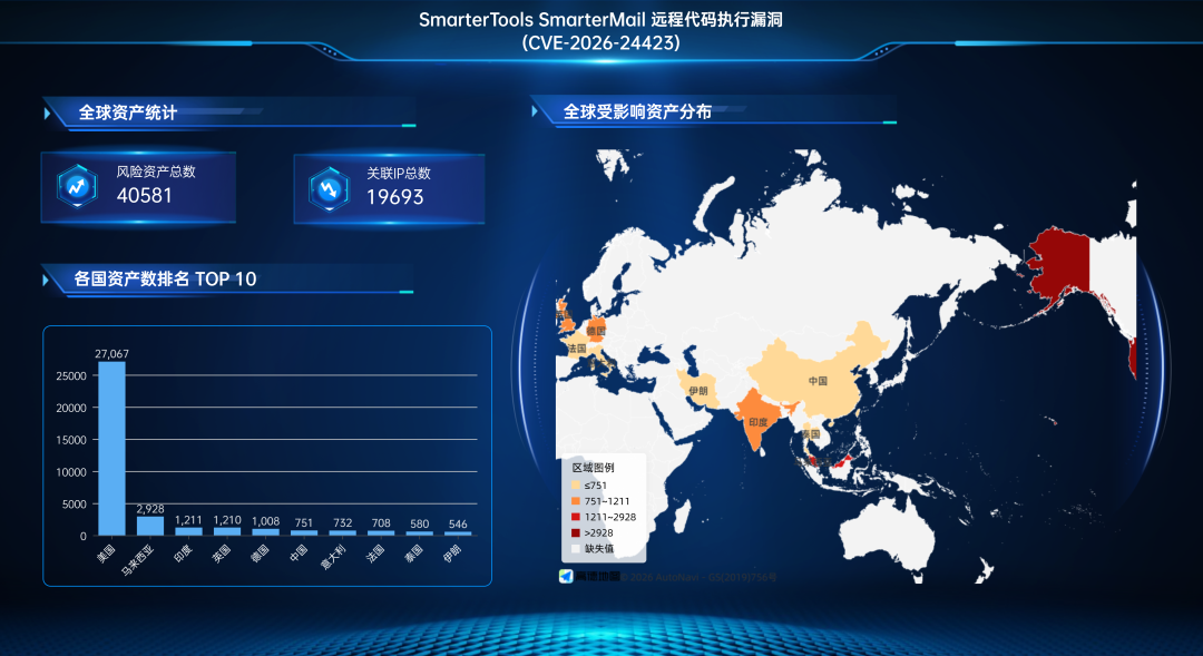 奇安信鹰图资产测绘平台数据显示,SmarterTools SmarterMail 远程代码执行漏洞(CVE-2026-24423)关联的全球风险资产总数为40581个,关联IP总数为19693个。全球风险资产分布情况如下: