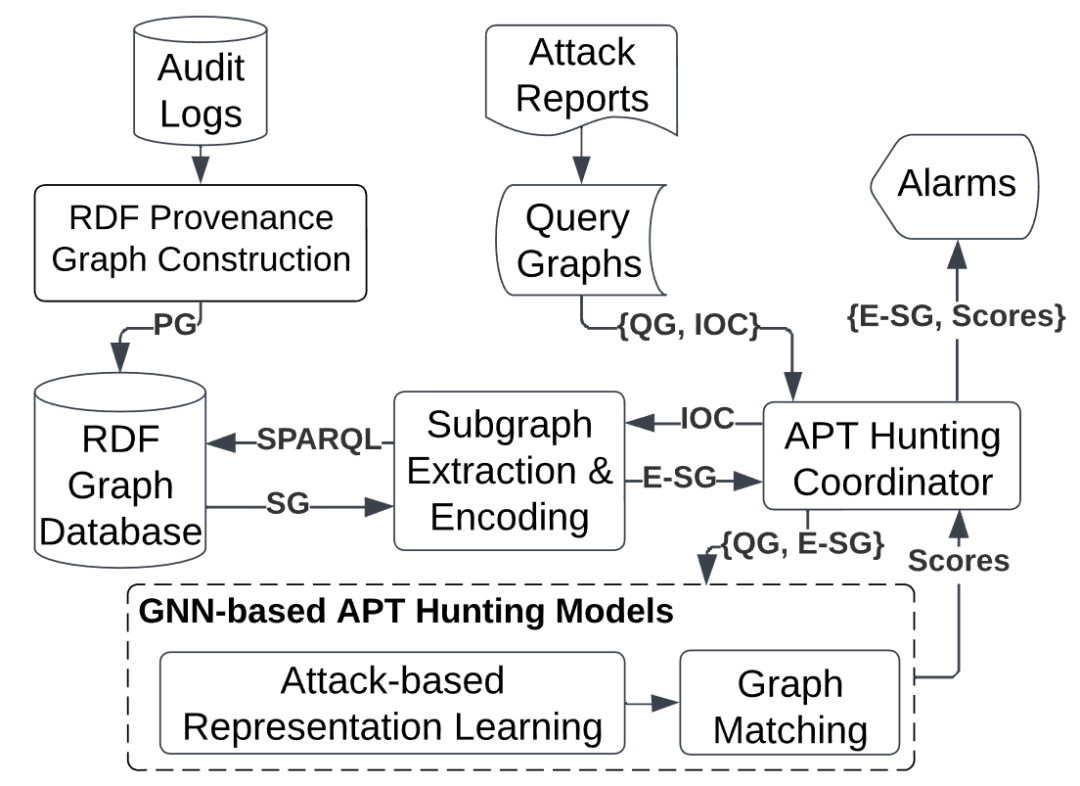 (2)技术深度:论文深入研究了如何将溯源图转化为 RDF 三元组并存储于图数据库中,以实现大规模溯源图的高效查询和子图提取,同时设计了基于 GNN 的攻击表示学习模型,能够自动学习攻击场景的图表示,避免了手动特征工程,技术含量高。