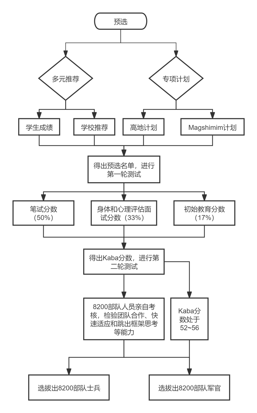 以8200部队为例,其早在高中阶段就开始识别潜在的优秀新兵,主要分为预选、第一轮测试和第二轮测试三个环节。预选过程采用多元评价和专项计划两种遴选方式:一是根据学生成绩和学校推荐筛选出部分学生,二是通过派驻全国的招募官员开展实地观察,综合识别具有发展潜力的学生。同时8200部队特别关注两项重点人才培育计划:其一是教育部主导的“高地”计划(Gvahim),该计划面向经济发达地区,通过开设编程与机器人课程,强化学生的科技创新实践能力;其二为Magshimim计划,该项目由以色列政府联合拉希基金会(专注贫困青少年扶持的非营利组织)共同发起,重点培养青年学生在数据科学与人工智能领域的核心素养,涵盖算法设计、程序开发、逻辑推理及数学建模等关键能力。在产生预选名单后,8200部队会对名单上的学生进行第一轮测试和面试,打出Kaba分数,该分数50%由初次笔试(DAPAR)决定,分为数学、阅读理解、指令、词语类比和形状类比等多个部分;33%由身体和心理评估面试(TZADAK)决定;17%由初始教育分数(TZHAR)决定,代表候选人接受的正规教育程度。总体而言,Keba分数大多在41~56分之间,52~56分的士兵有机会成为军官。第二轮测试与前一轮不同,主要衡量新兵的知识(如数学、语言、编码等)、好奇心、决心、分析思维和领导技能,以及他们团队合作、快速适应和跳出框架思考等相关能力,由8200部队人员亲自考核。该选拔方式确保服役的情报人员具备掌握高新技术、运用创新思维解决实际问题的核心竞争力。