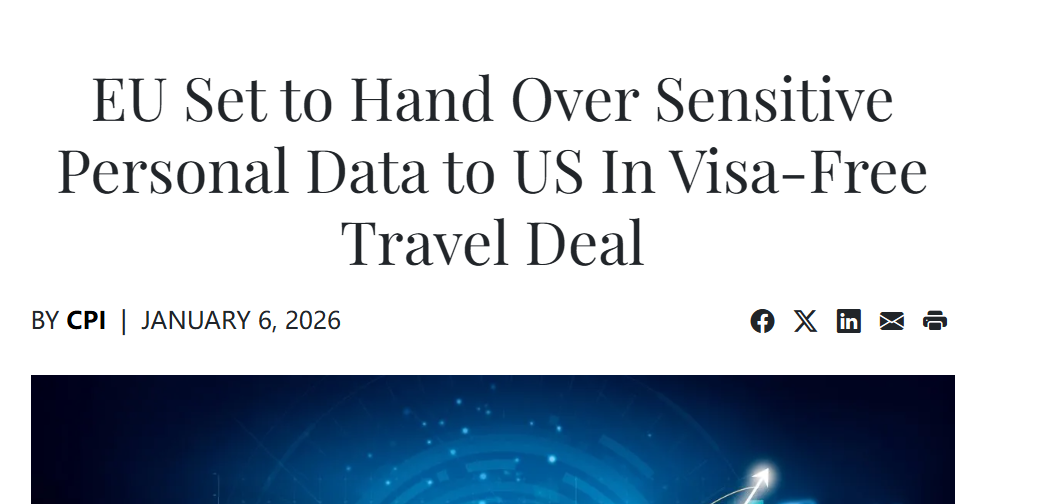 欧盟正计划向美国开放包含其公民种族、信仰及生物识别特征等敏感个人数据的数据库访问权限,以换取维持对美免签证旅行待遇。尽管欧盟内部存在关于隐私保护及数据处理比例原则的担忧,且欧洲数据保护监管局(EDPS)警示此举将创下“大规模数据共享”的先例,但欧洲理事会已授权欧盟委员会就此“强化边境安全伙伴关系”(EBSP)框架协议展开谈判,并预计于今年年底前投入运行。