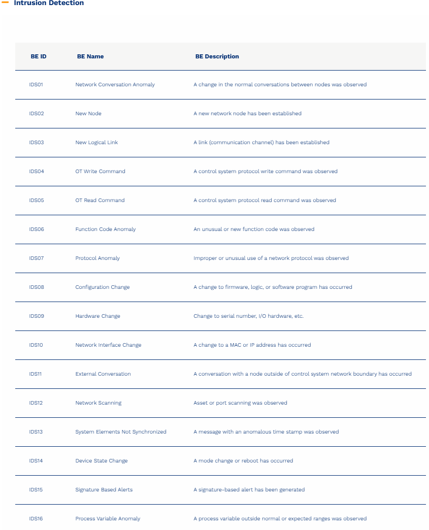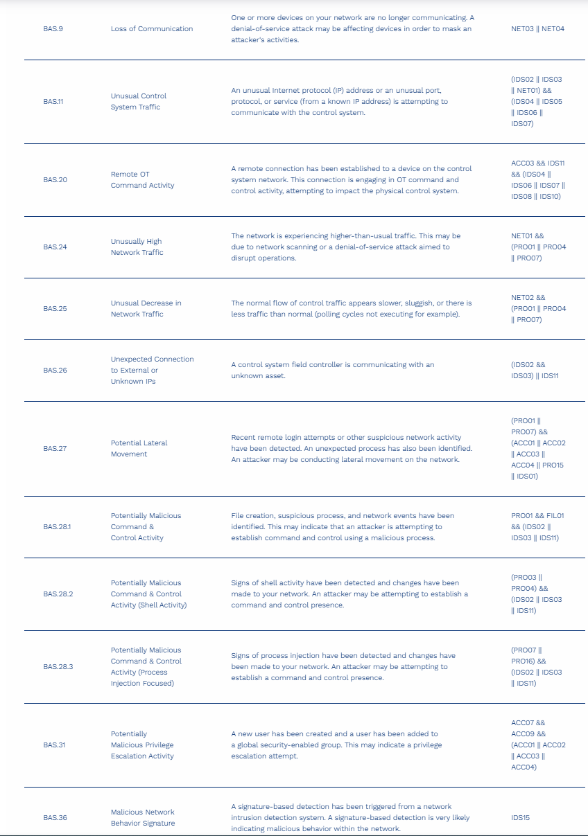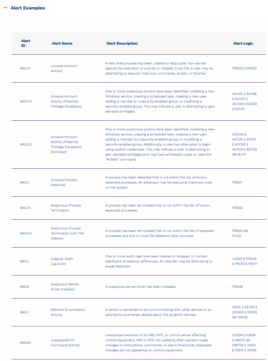 然后,系统会利用关联规则评估这些已标记的传感器事件,并生成警报。BAS/CS关联规则会逻辑地评估一段时间窗口内的行为标签以及受影响的系统。当识别出一组行为时,系统会触发警报。例如,与工作站关联的“新建命令/脚本(PRO03)”和“OT写入命令(IDS04)”行为会触发“意外的OT命令和控制Shell警报(BAS 8.2)”,该警报会发送给该系统的安全人员。与传感器事件标识一样,关联检测规则和警报语言在各个系统中都是标准化的。