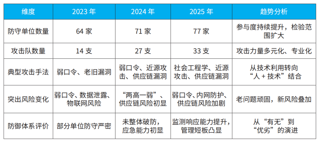 本部分从演习规模、攻击技术、防御成效维度对三年数据进行对比分析。