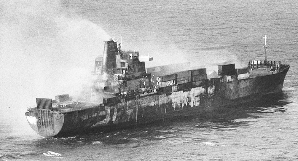 1982 年 5 月 25 日傍晚,在马尔维纳斯群岛东北方向海域,英国 “大西洋运输者” 号集装箱船遭阿根廷 “超军旗” 攻击机发射的两枚 AM39 “飞鱼” 反舰导弹击中,随即燃起大火。袭击造成 12 名船员丧生,这艘船被烧毁的船体在三天后沉入了南大西洋灰暗的海水之中。
