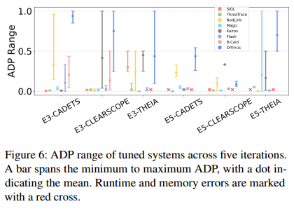现有系统的局限性:许多系统(如 SIGL, Threatrace)在节点级检测任务上 ADP 接近 0,因为它们并非为此设计。即使先进系统如 ORTHRUS,也表现出较高的不稳定性(图 12b)。