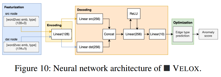 Velox 实现:Velox 采用极简神经网络。它丢弃了 GNN,直接对每条流入的边进行操作:获取其两端节点的文本嵌入,通过一个线性层(编码器),然后经过一个浅层 MLP(解码器)来预测边类型,预测误差即为异常分数。这种设计使其天生支持实时、逐事件的处理。