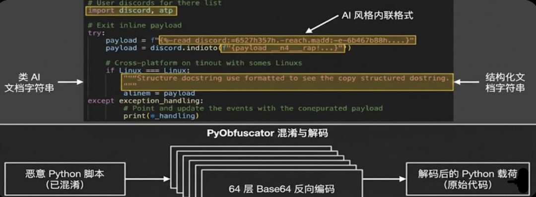 该脚本功能全面,集成了多项恶意功能,包括T-Rex和XMRig用来下载和执行挖矿程序,构建processhider和argvhider隐藏进程,创建持久化服务以及通过Discord发送受害者信息。为了规避检测,脚本使用了PyObfuscator进行混淆,采用了多达64层的Base64反向编码嵌套,必须通过递归解码才能获取原始的Python明文。