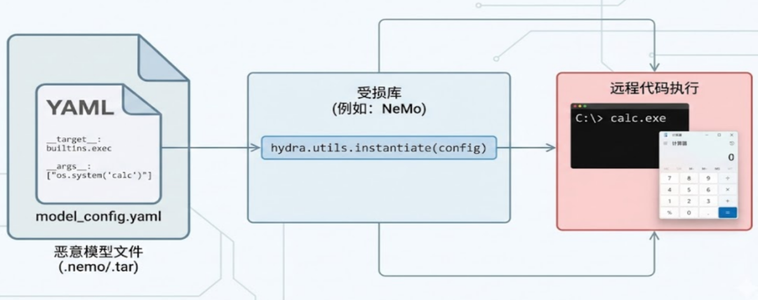 以NVIDIA NeMo为例,攻击者可以篡改模型文件,该文件本质上是一个包含model_config.yaml的TAR包。在恶意的YAML文件中,攻击者将target设置为builtins.exec,并在args中注入系统命令,如os.system("calc.exe")。