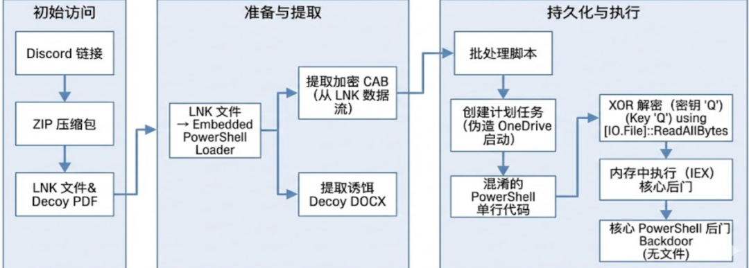此次活动的感染链展示了该组织典型的多阶段投递特征,但在诱饵和目标选择上有了显著变化。攻击者通过 Discord 等渠道散布钓鱼链接,诱导受害者下载恶意 ZIP 压缩包文件。为了增加可信度,压缩包内包含一个伪装成区块链项目文档的诱饵PDF文件和一个恶意的 Windows快捷方式.lnk文件。这些诱饵通常涉及区块链项目的架构、技术栈、开发时间表等专业内容,极易引起目标人群的兴趣和信任。