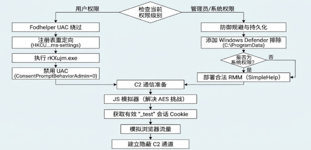 攻击者在此版本中引入了复杂的权限管理与反制机制,根据当前权限上下文动态调整攻击策略,若当前为普通用户权限,恶意软件会利用fodhelper.exe漏洞。通过修改注册表HKCU\\Software\\Classes\\.thm\\Shell\\Open\\command,将ms-settings协议重定向至攻击者控制的可执行文件rKXujm.exe。该程序执行后会静默修改ConsentPromptBehaviorAdmin注册表键值为0,从而彻底关闭管理员批准模式下的UAC弹窗。获得管理员权限后,脚本立即将C:\\ProgramData添加至Windows Defender的排除列表。若检测到SYSTEM权限,则直接部署合法的远程管理工具 SimpleHelp,建立长期、全功能的远程控制通道。
