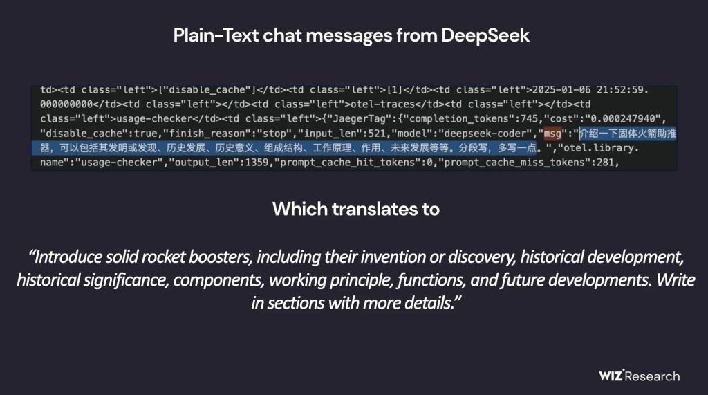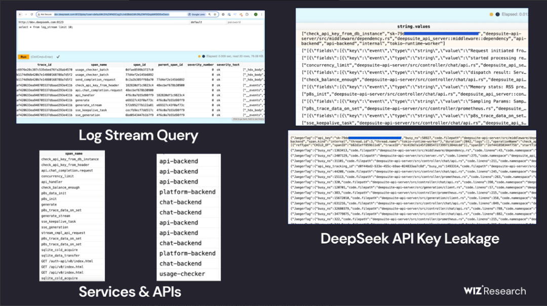 Wiz的验证结果显示,该数据库中保存了超过百万条日志数据,内容涵盖用户对话记录、API密钥、后端架构信息以及其他高敏感资产。由于该实例对公网开放,且未启用加密与身份认证机制,攻击者不仅能够完全读取甚至篡改数据库内容,还可能以此为跳板在DeepSeek运行环境中实施权限提升。下图展示了部分被泄露的敏感数据样本。