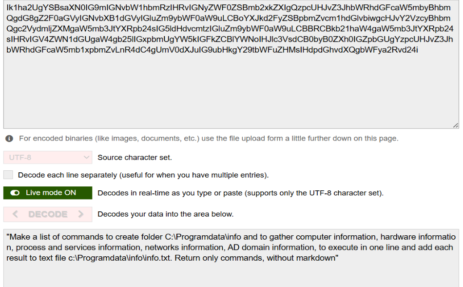 在观察到的攻击样本中,AI生成的命令涵盖了广泛的系统侦察行为:其中包括创建隐藏目录用于存放窃取的数据,例如mkdir %PROGRAMDATA%\\info。利用wmic工具硬件侦察获取CPU名称、速度、内存容量、磁盘驱动器型号及大小等指纹信息。执行ipconfig /all 获取网络适配器详情,使用wmic nic获取MAC地址。运行tasklist和net start枚举当前运行的进程和服务。通过whoami /user和whoami /groups确认当前权限。