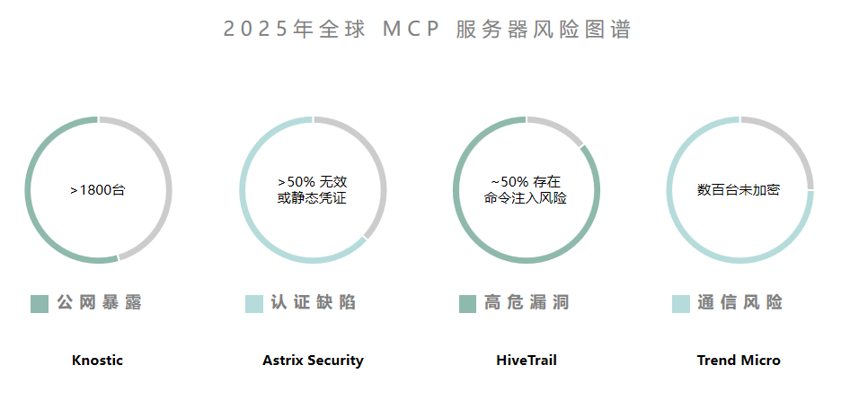 在AI代理(Agent)互联层面,模型上下文协议(MCP)的广泛采用带来了更为复杂的安全挑战。自2025年3月OpenAI标准化该协议以来,MCP虽迅速成为AI助手连接外部生态的通用接口,但其部署现状却充斥着严重的认证缺失与配置缺陷。为了直观展示这一新兴威胁面的严重程度,我们汇总了Knostic、Astrix Security等多家机构的监测数据(如下图所示)。分析指出,互联网上已存在大量直接暴露的MCP服务器:超过1800台实例允许在无认证情况下访问内部工具列表,而在5000余个开源实现中,半数以上依赖几乎不轮换的静态凭证或完全缺乏认证机制。更令人担忧的是,HiveTrail的研究揭示了近一半的开源MCP服务器存在命令注入漏洞,且普遍允许不受限制的URL请求,这实际上构建了一条通往云元数据服务或内部网络的SSRF攻击快车道。