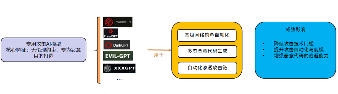 当前,网络犯罪地下生态正加速构建以“武器化AI”为核心的高级攻击体系,通过“网络犯罪即服务(CaaS)”模式向攻击者提供工业级的破坏能力。以WormGPT、FraudGPT为代表的黑帽工具,系基于GPT-J等开源模型并在恶意软件、钓鱼数据上进行微调(Fine-tuning)而成,专门用于生成无语法错误的多语言钓鱼邮件、多态恶意代码以及商业邮件泄露(BEC)素材。与此同时,DarkBERT等原本用于合法暗网研究的模型在被越狱或重新包装后,亦被滥用于降低漏洞开发门槛。此类工具不仅具备极强的语境保持与检测规避能力,近期更出现了构建在Grok、Mixtral等主流商用大模型之上的变体,攻击者仅需支付低廉的订阅费用,即可通过越狱手段绕过安全限制,获取高质量的攻击辅助。
