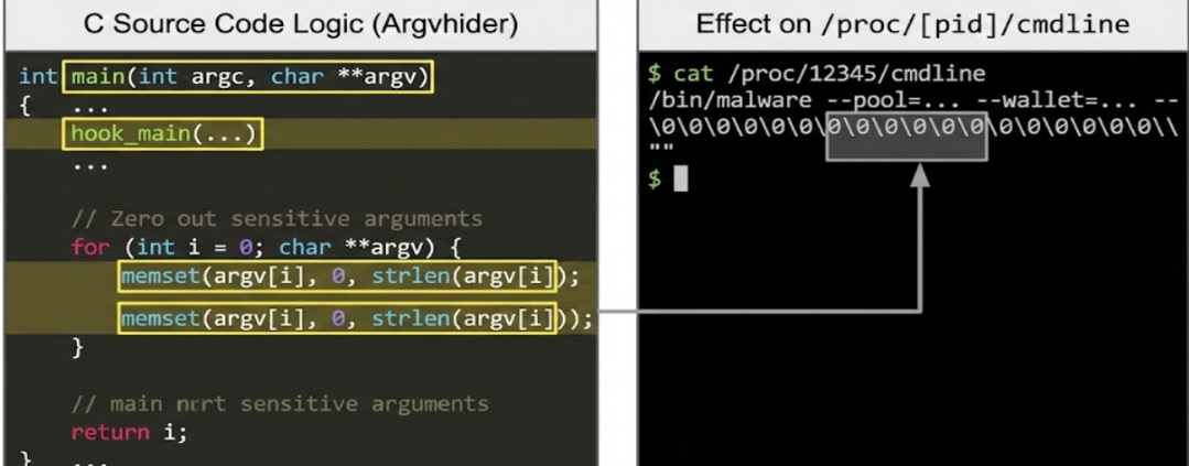 攻击者在Linux环境下使用了一种更为独特的防御规避技术。脚本并未直接运行二进制文件,而是包含了两个C语言程序的源码,并在运行时即时编译为共享对象.so文件,通过LD_PRELOAD进行加载。其中一个工具命名为Processhider,该工具通过hook readdir和readdir64系统调用,硬编码过滤掉系统的进程名,从而使恶意挖矿进程在ls和ps等命令中不可见。另一个工具Argvhider使用了一个较为少见的技术,它不挂钩系统调用,而是通过挂钩main函数,通过glibc修改堆栈,使用memset将原始参数内存填充为0,从而在/proc/[pid]/cmdline中隐藏挖矿池地址和钱包ID等敏感参数。这种“自带源码、现场编译”的手法极大地提高了攻击的灵活性和隐蔽性,使基于静态签名的安全工具难以检测的到。