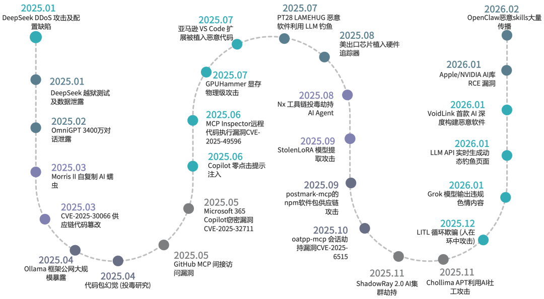 如前所述,随着大模型与AI基础设施被大规模引入生产环境,其安全风险已不再局限于传统的模型越狱或内容滥用,而是迅速扩展到AI基础设施、硬件安全、模型安全、数据泄漏、供应链、Agent权限以及AI武器化等层次领域。本章节我们将以时间线为主线,对过去一年在上述各领域具有代表性的多起大模型与AI生态安全事件进行系统回顾与分析,并梳理这些事件的关键节点、深入分析其产生的原因及其对用户和社会的广泛影响,以揭示当前AI安全风险从“模型层问题”向“系统性风险”演化的整体趋势。