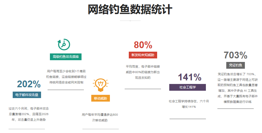 当前的威胁态势正呈现出爆发式扩张特征。监测数据显示(如下图所示),仅在短短6个月内,钓鱼消息总量增长了202%,其中凭证窃取类攻击更是激增703%。与此同时,攻击路径正发生显著迁移,从单一的电子邮件渠道向企业协作平台(如Slack、Teams)、短信及社交媒体快速渗透;ShinyHunters与Scattered Spider等团伙的活跃案例证实,多渠道攻击已成为常态。在防御层面,据VARONIS研究指出,得益于AI的自动化变异能力,约80%的恶意链接被判定为此前未知的零日威胁。