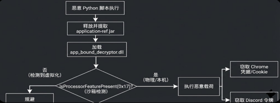 在 Windows 环境下,恶意脚本释放了一个包含多个恶意组件的JAR包文件。该文件内含一个名为 app_bound_decryptor.dll的64位Windows动态链接库,负责XOR编解码和命名管道通信。另外,还采用了一种较新的沙箱检测技术,通过调用IsProcessorFeaturePresent(PF_FASTFAIL_AVAILABLE),检查_fastfail()功能可不可用,因为大部分沙箱环境都不支持这个属性,攻击者利用这一差异判断当前代码是否运行在沙箱环境中,从而决定执不执行后续的窃密行为。此外,恶意代码还试图从Chrome扩展和Discord中窃取凭证和认证令牌,进一步扩大攻击影响。