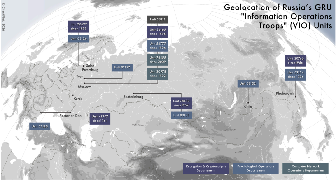俄罗斯武装力量总参谋部情报总局信息作战部队 2014 年完成正式整合,由 GRU55111 部队担任指挥中枢,整合 GRU 旗下心理作战加密密码分析计算机网络作战三类传统单位,核心承担境外主动式全域信息对抗任务,契合俄罗斯信息空间与信息对抗的军事理念,形成心理作战与网络作战深度融合的作战体系,下辖至少 15 支作战单位,分布于俄罗斯全境。