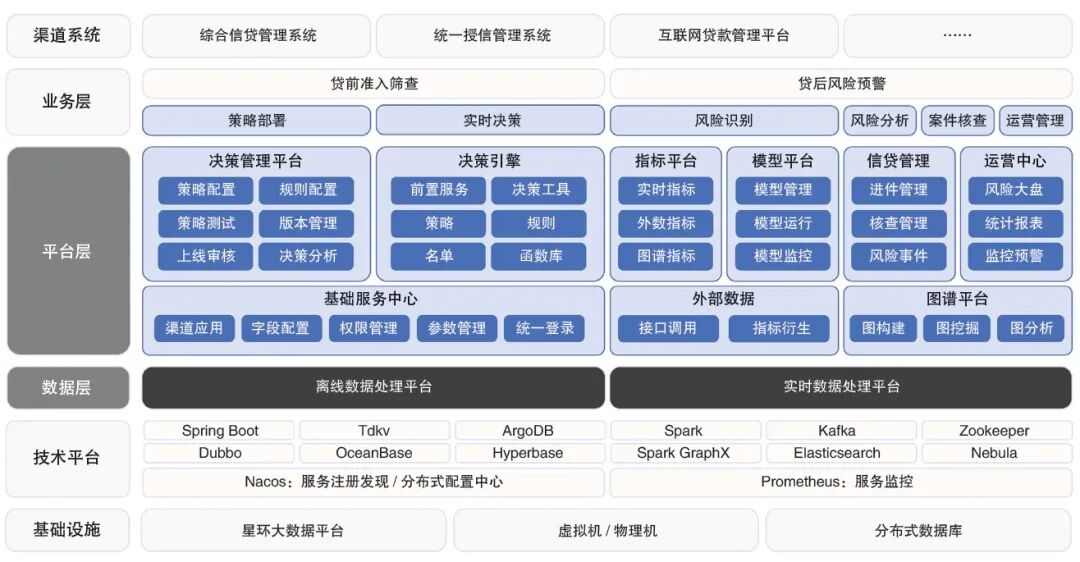 数据层通过构建“离线+实时”双处理体系,有效兼顾了效率与成本需求。其中,离线数据处理平台通过整合星环TDH、Nebula Graph、Elasticsearch等技术,可支持批量数据清洗、图数据分布式计算与全文检索,并采用连通分支算法开展图分析,使计算效率较传统单机模式提升8倍;实时数据处理平台基于内存存储与分布式集群架构,可支撑每秒2000余笔交易的风险扫描,进而将贷后预警周期从30天缩短至1天。