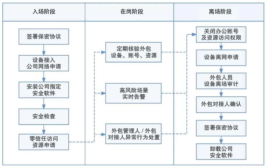 为切实落实管理制度对外包人员代码安全管控要求,金融机构须在外包人员入场、在岗、离场等阶段设置对应的管控流程和节点(如图1所示)。