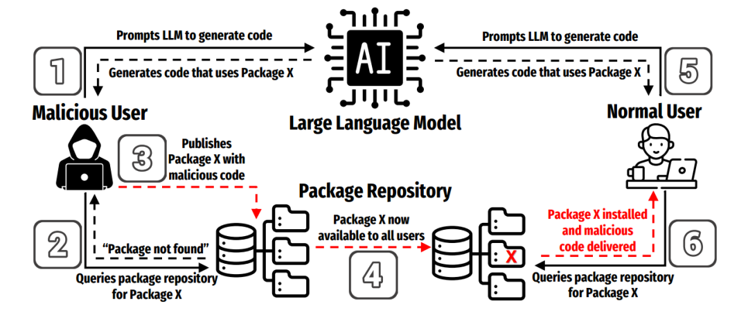 本文系统研究了一种安全威胁:Package Hallucination(包幻觉)。该现象指 LLM 在生成代码时推荐了现实世界中并不存在的第三方包名。在普通软件工程视角下,这只是“模型出错”;但在安全视角下,它构成一个可被直接武器化的攻击面,攻击者可以在 PyPI 或 npm 中抢先注册这些幻觉包名并植入恶意代码,当开发者照抄模型生成的 pip install 或 npm install 命令时,即会下载并执行攻击者的恶意依赖,从而形成一种新型的供应链投毒攻击,其流程如图一所示。