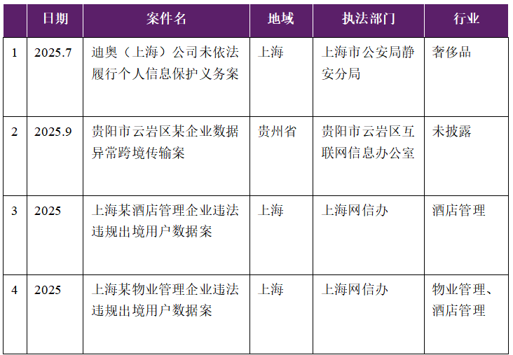 尽管监管框架日趋完善,但目前公开披露的违反数据出境监管要求的执法案例数量仅有四起。这四起案件均发生在2025年,2025年之前的执法案例则付之阙如。例如,2026年1月,上海网信办发布2025年网络数据安全执法典型案例[1],共八起案例中包含两起未落实数据跨境安全管理要求、导致数据违法违规出境的案件,涉及酒店管理、物业管理等重点行业,显示出监管部门对数据出境违规行为的执法方向。