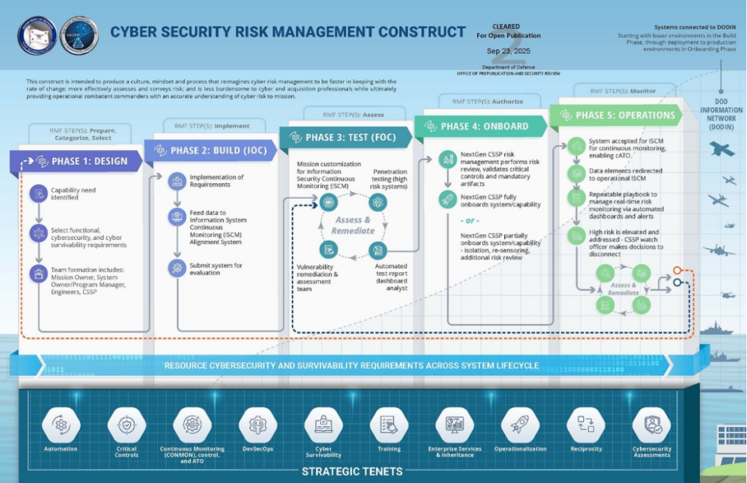 9月,美战争部宣布实施“网络安全风险管理架构”,以对其网络安全风险管理模式进行根本性变革,实现从静态合规转向动态、持续和基于风险的主动防护。该架构以自动化、持续监控和弹性为核心,包含五个阶段和十项原则,其中五个阶段分别为设计、构建、测试、部署和运行,十项原则分别为自动化、关键控制措施、持续监控与运行授权(ATO)、开发、安全及运行(DevSecOps)、网络生存能力、培训、机构服务与传承、运营化、互惠性和网络安全评估。该架构详述了安全设计、压力测试和实时态势感知等每个阶段和每项原则的关键要素,以推动美军建立可验证、被持续监控且具备主动防御能力的加固网络环境。该架构的实施,预示美军正致力于将网络安全深度融入系统全生命周期,通过工程化方法和自动化工具,构建更具弹性和适应性的网络防御体系。
