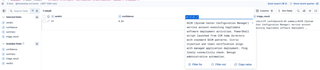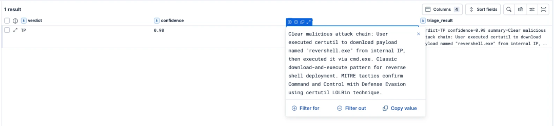 DISSECT命令解析大模型的输出,提取出判定结论和置信度得分。最终,仅将置信度高且被大模型判定为真实的威胁(TP)或可疑(SUSPICIOUS)的结果生成最终的严重告警。