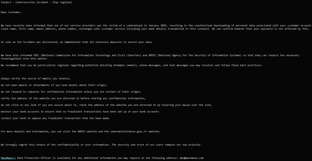 ManoMano 向 BleepingComputer 提供的通知样本中包含对客户的建议,包括核验 incoming 通信与发件人身份、监控银行账户是否存在欺诈交易、避免点击可疑链接或下载邮件附件。