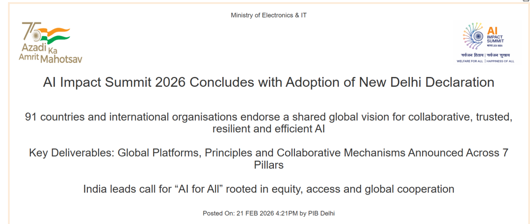 近日,新德里人工智能影响力峰会圆满落幕。会上通过了《人工智能影响峰会宣言》(AI Impact Summit Declaration ,以下简称《宣言》)。据悉,《宣言》最初由80多个国家共同签署,后续持续有国家及国际组织加入,最终获得中、美、英、法、俄等91方认可(签署名单见下文附表),成为全球人工智能合作进程中的重要里程碑之一。