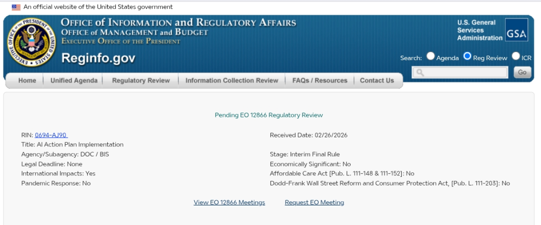 根据美国Reginfo网站信息,美国商务部工业与安全局(BIS)于2月26日向信息与监管事务办公室(Office of Information and Regulatory Affairs)提交了一个标题为“AI Action Plan Implementation”(人工智能行动计划实施)的临时最终规则以进行跨部门审查。