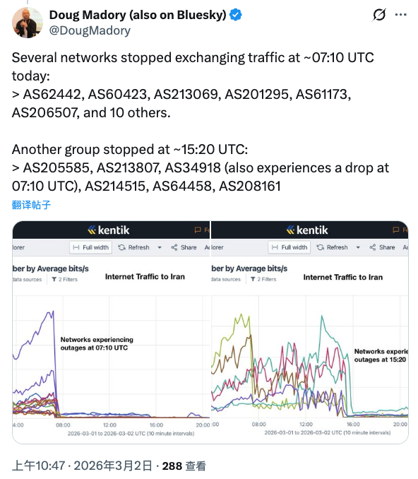 互联网分析公司Kentik互联网分析总监Doug Madory在X平台发文称,伊朗的互联网连接在格林尼治时间7:06大幅下降,并在11:47再次出现下滑,仅剩下极少数连接。