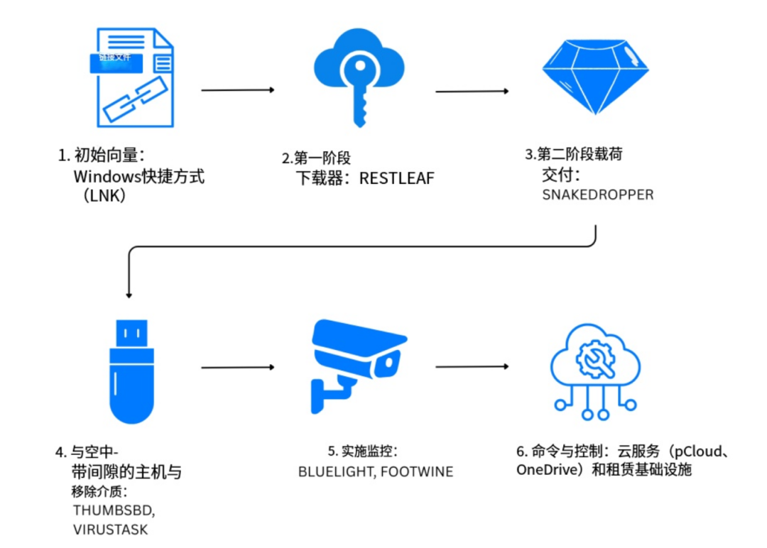这些工具包括 RESTLEAF 、 SNAKEDROPPER 、 THUMBSBD和 VIRUSTASK ,它们会下载一个包含 FOOTWINE和 BLUELIGHT的有效载荷,从而对受害者的系统进行监视。