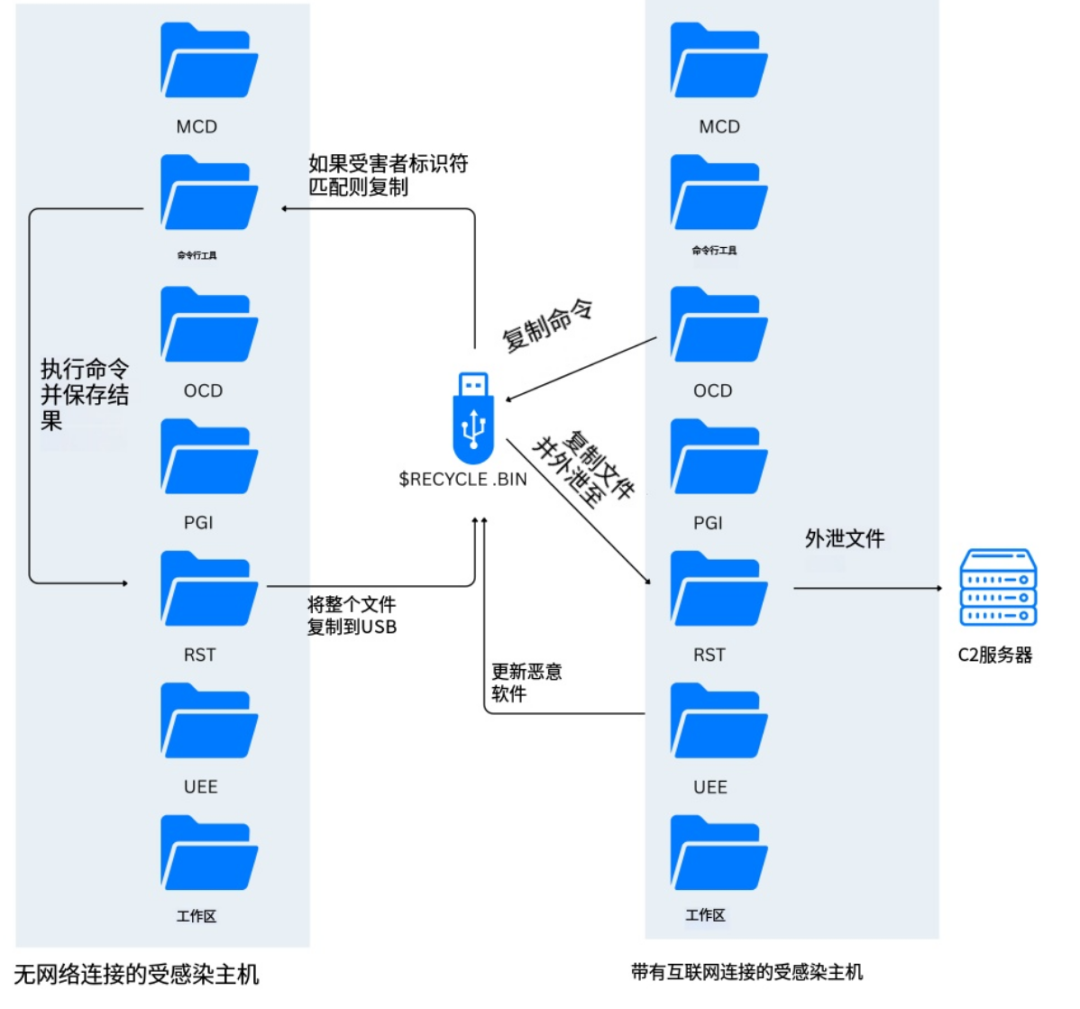 而一旦物理隔离网络内的主机被攻陷,主机上的 VIRUSTASK 就会继续感染后续插入的所有可移动介质,让攻击载荷随着用户日常的文件传输行为,在整个物理隔离网络内部横向扩散,逐步渗透多层隔离的网络环境,不断扩大攻击的覆盖范围。