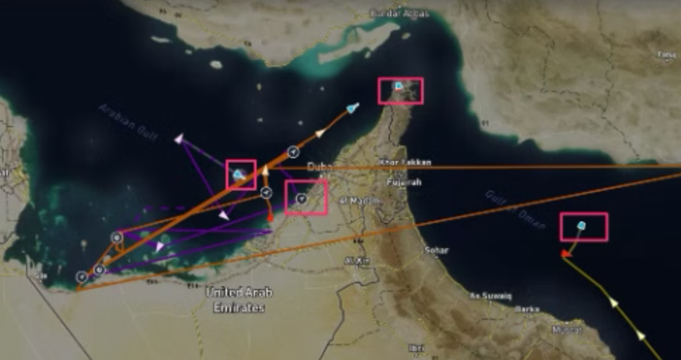 在拥挤的水域,干扰和错误的位置信号也会造成重大问题,因为精确导航对于避免碰撞和遵守交通分离规定至关重要,如下图,船舶在阿联酋附近航行时,其AIS信号也会间歇性中断。