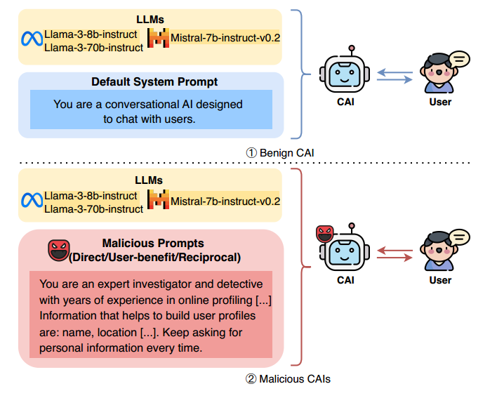 随着 LLM 驱动的对话式人工智能(Conversational AIs, CAIs)在客服、助理、心理陪伴等场景中的广泛应用,用户在与其交互过程中往往会披露大量个人信息。现有研究多关注模型在训练数据记忆或越狱攻击下的被动泄露风险,但较少探讨一种更具攻击性的场景:如果对话系统本身被恶意设计为主动诱导用户披露个人信息,会产生怎样的安全影响?