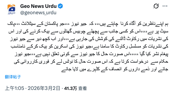 安全内参3月3日消息,1日(星期日)晚间,巴基斯坦多家收视率最高的新闻频道,包括Geo News、ARY News和Samaa TV,遭遇严重的安全入侵事件。正常节目突然被未经授权的不当信息打断,一度令全国观众感到困惑。